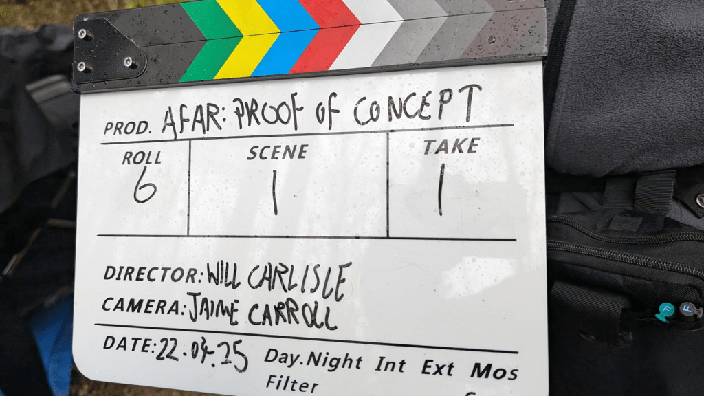 Filming finally commenced for Afar’s Proof of Concept on Tuesday 22nd April. A small, dedicated team ventured into the woods with a trolley of equipment.